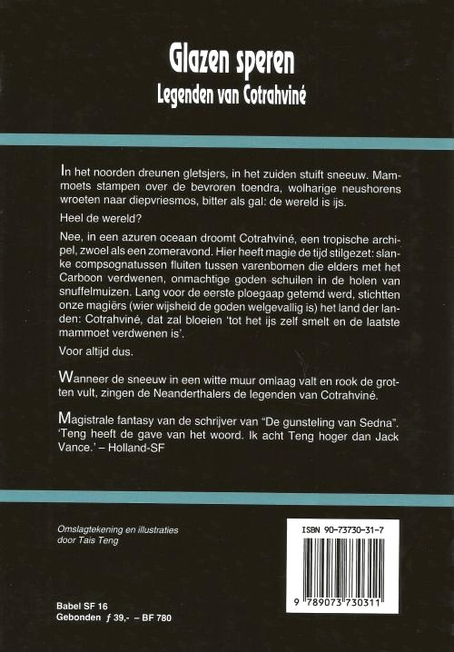 Nee, in een azuren oceaan droomt Cotrahviné, een tropische archipel, zwoel als een zomeravond. Hier heeft magie de tijd stilgezet: slanke compsognatussen fluiten tussen varenbomen die elders met het Carboon verdwenen zijn, onmachtige goden schuilen in de holen van snuffelmuizen. Lang voor de eerste ploegaap getemd werd, stichtten onze magiërs (wier wijsheid de goden welgevallig is) het land der landen: Cotrahviné, dat zal bloeien 'tot het ijs zelf smelt en de laatste mammoet verdwenen is'.